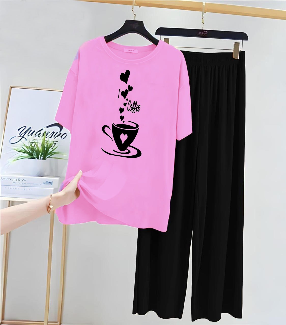 • Bottoms: Matching black wide-leg pants ensure a cohesive and stylish ensemble.