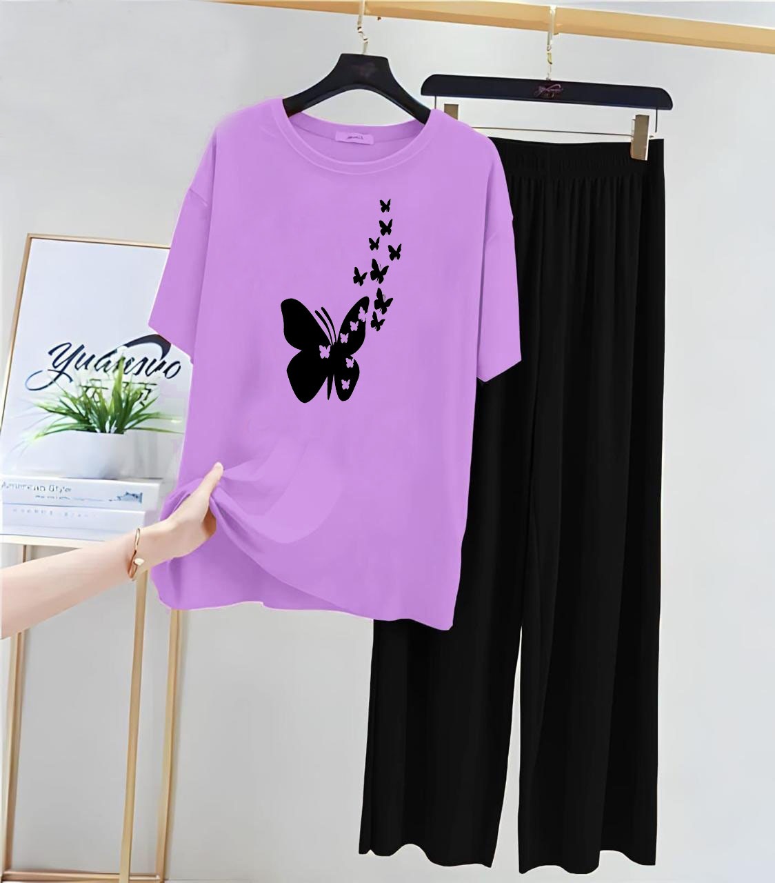 • Bottoms: Black wide-leg pants in a silky, lightweight material for maximum comfort.